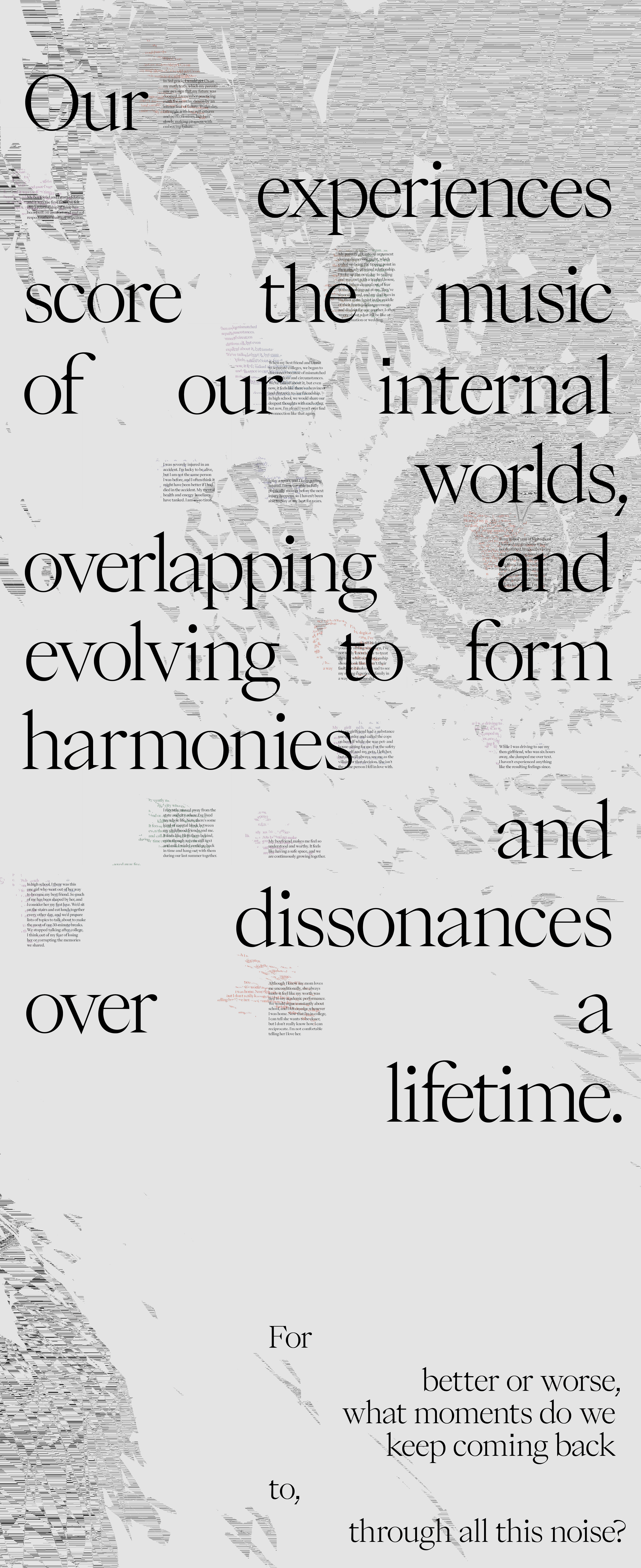 I was tasked with creating an exhibition that helps my peers understand human character, aiming to spark reactions and reflections. I chose to focus on moments that shape our character, and asked my peers, "What is an experience you haven't yet gotten over?"
