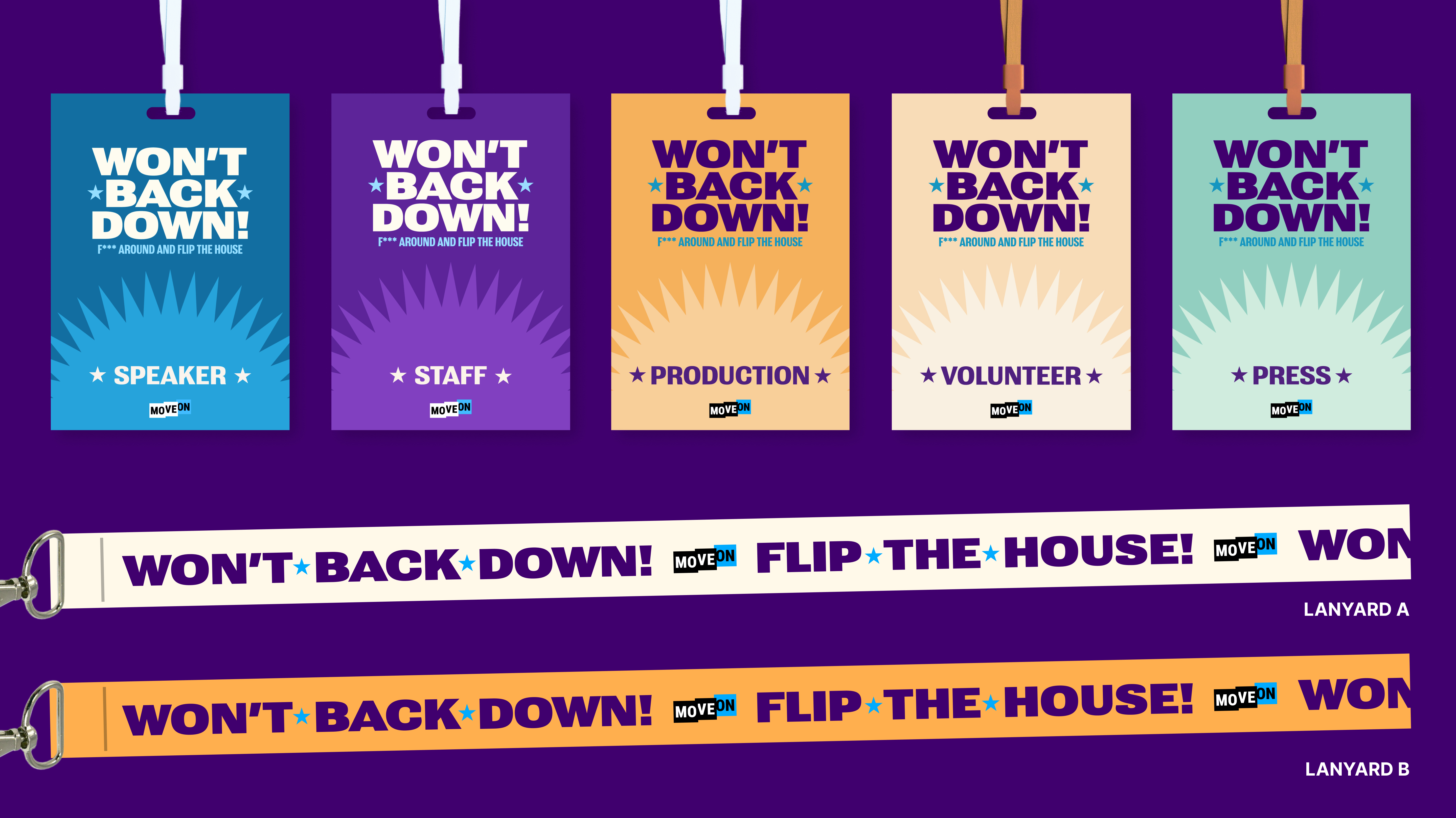 I worked on collateral for Won't Back Down, a rally series aimed at re-taking the House in 2026. I co-created social media graphics, badges, lanyards, stage scrims, podium signs, billboards, invitations, crowd signage, and more.
